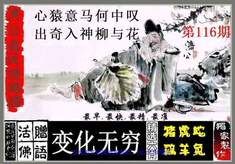 116期:济公特码诗:心猿意马何中叹,出奇入神柳与花(开:马24)解:心猿意马何中叹,出奇入神柳与花,解肖猪虎蛇鸡羊兔 九肖:鸡猴马牛蛇狗兔虎龙 六肖:鸡猴马牛蛇狗 三肖:鸡猴马